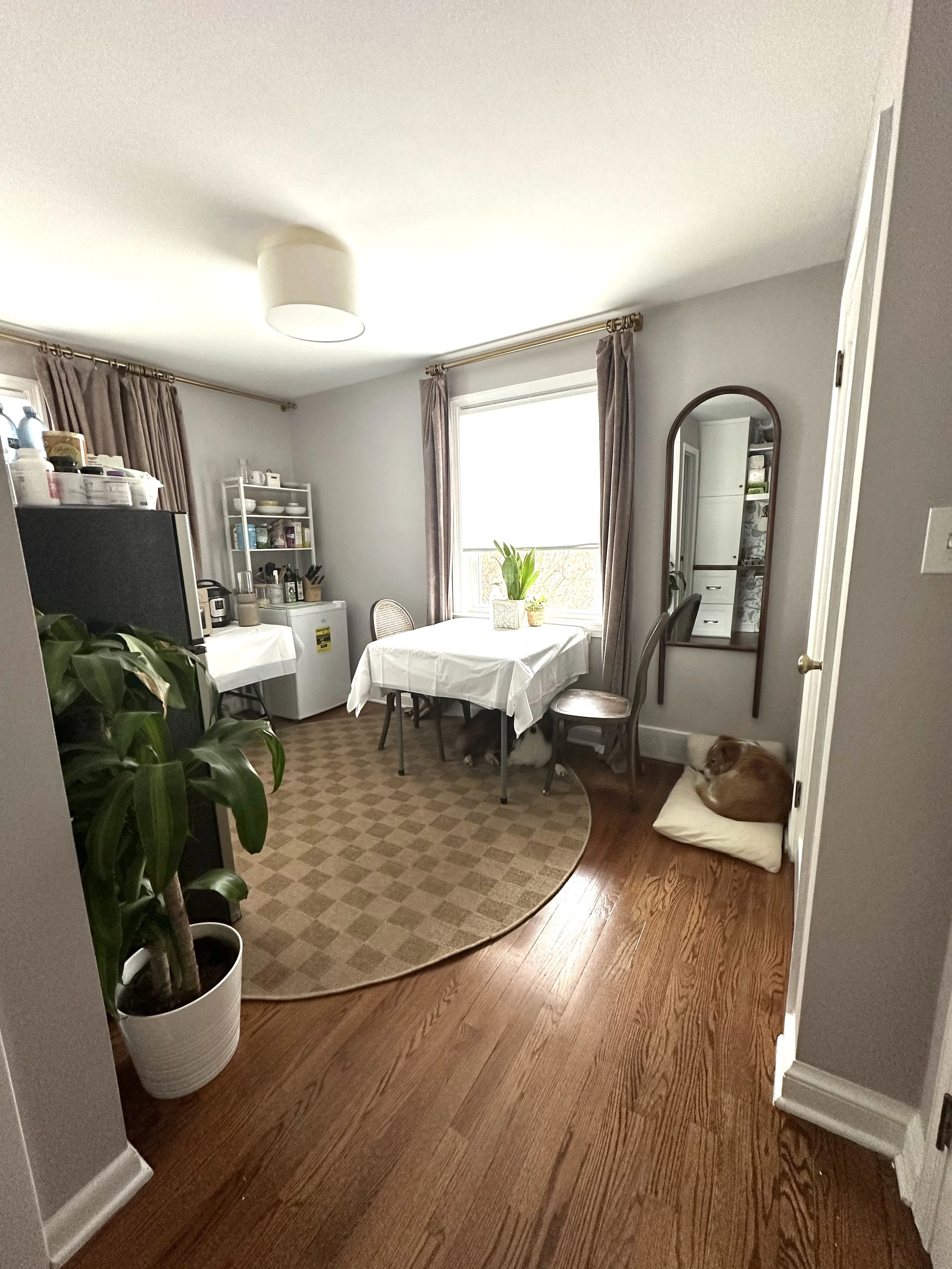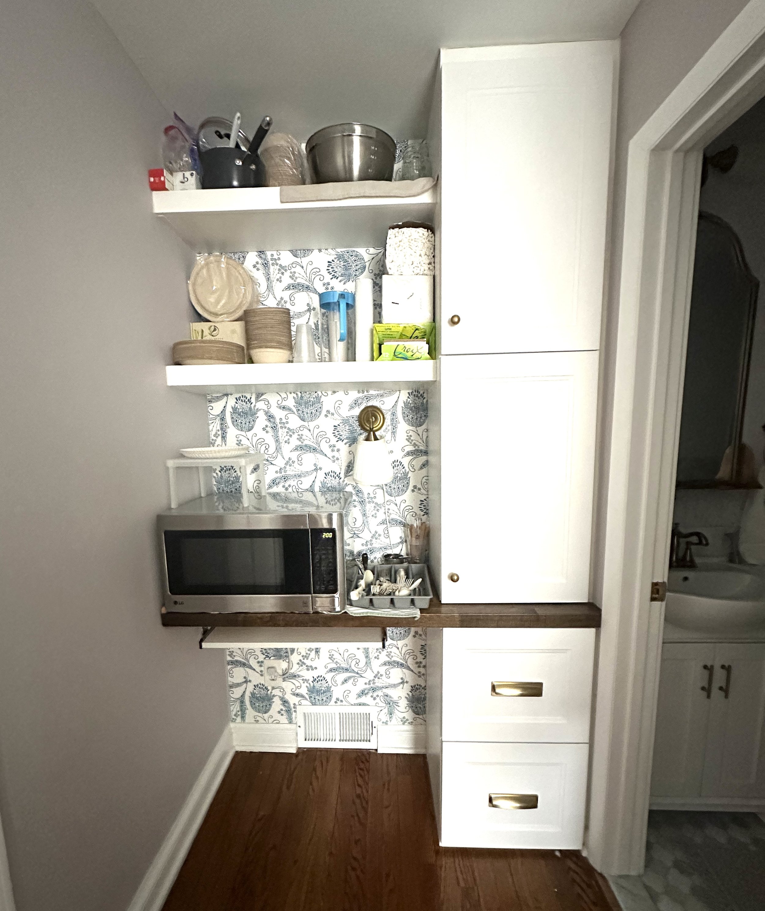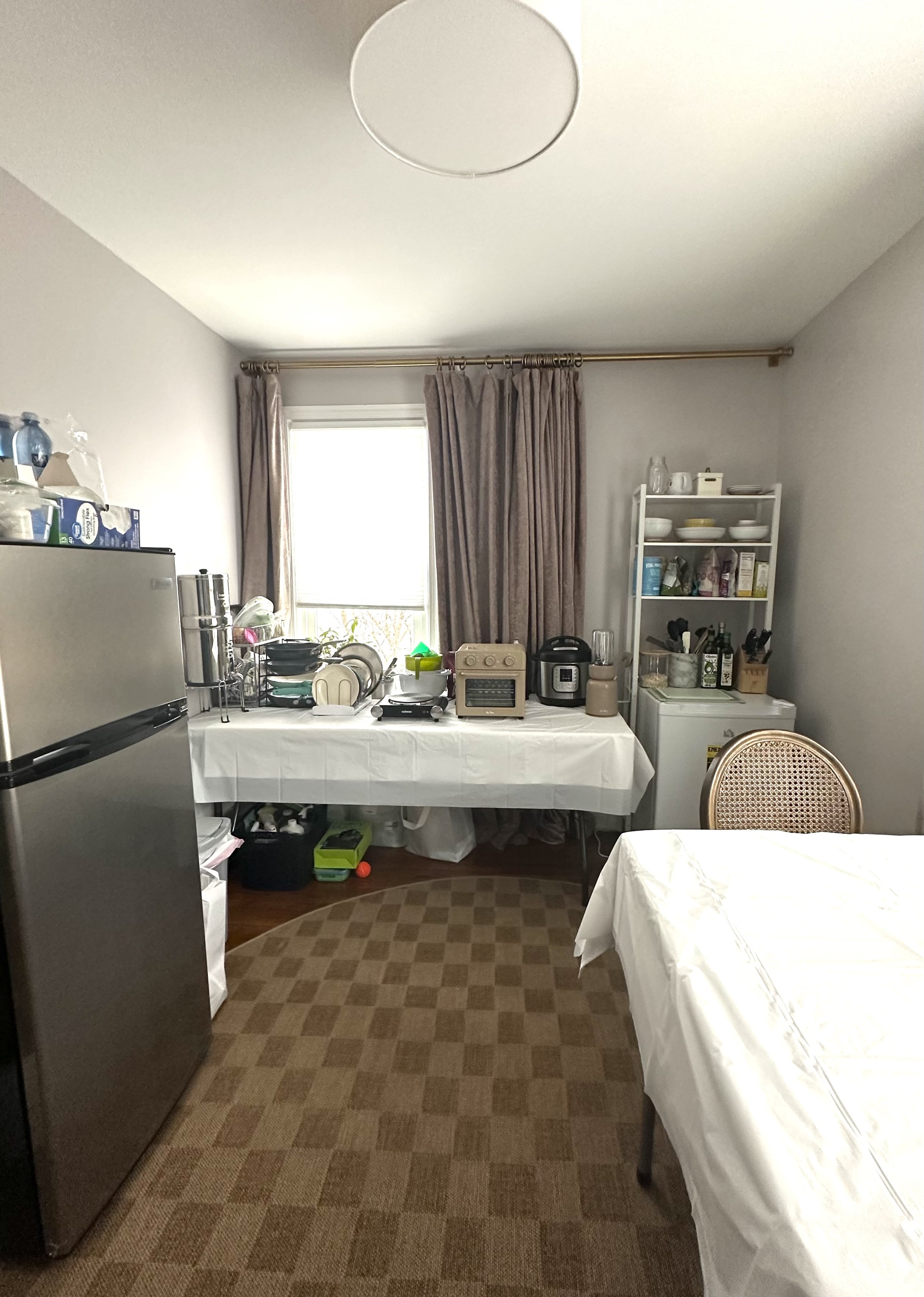 During our renovation, we used an apartment-sized fridge and freezer combo, along with a separate small standing freezer to hold all of those prepared meals. Both fit easily through the doorway of our guest room and provided plenty of storage for this downsized setup.